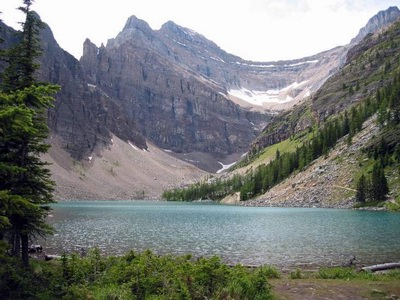 kleiner als der Lake Louise, wird aber auch von hohen Bergen eingerahmt. Statt